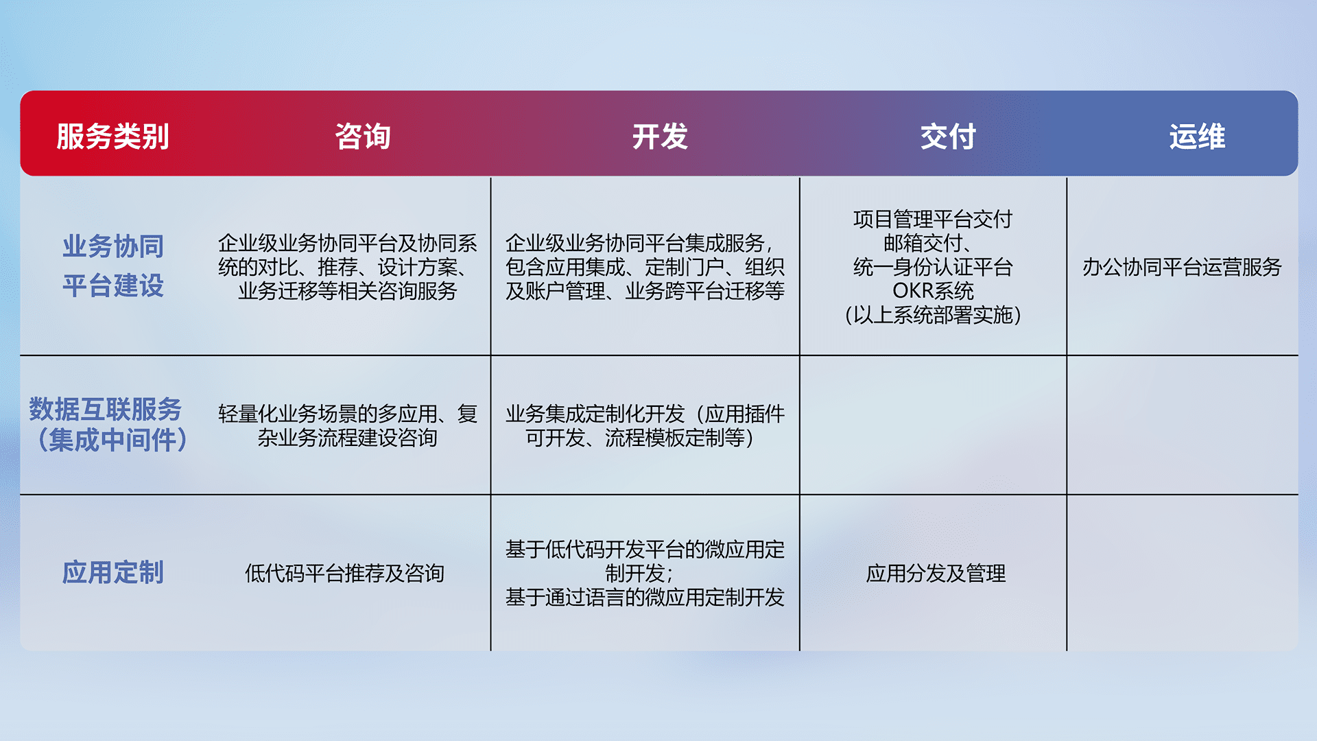 针对钉钉、、、、企微、、、、IDaas等平台级产品提供产品的规划、、、、方案、、、交付、、、、定制化开发等服务,,,,实现如统一协同办公、、、智能客户服务、、、混合会议管理、、、、智能数据查询、、、等业务场景,,,,实现数字化转型。。。。