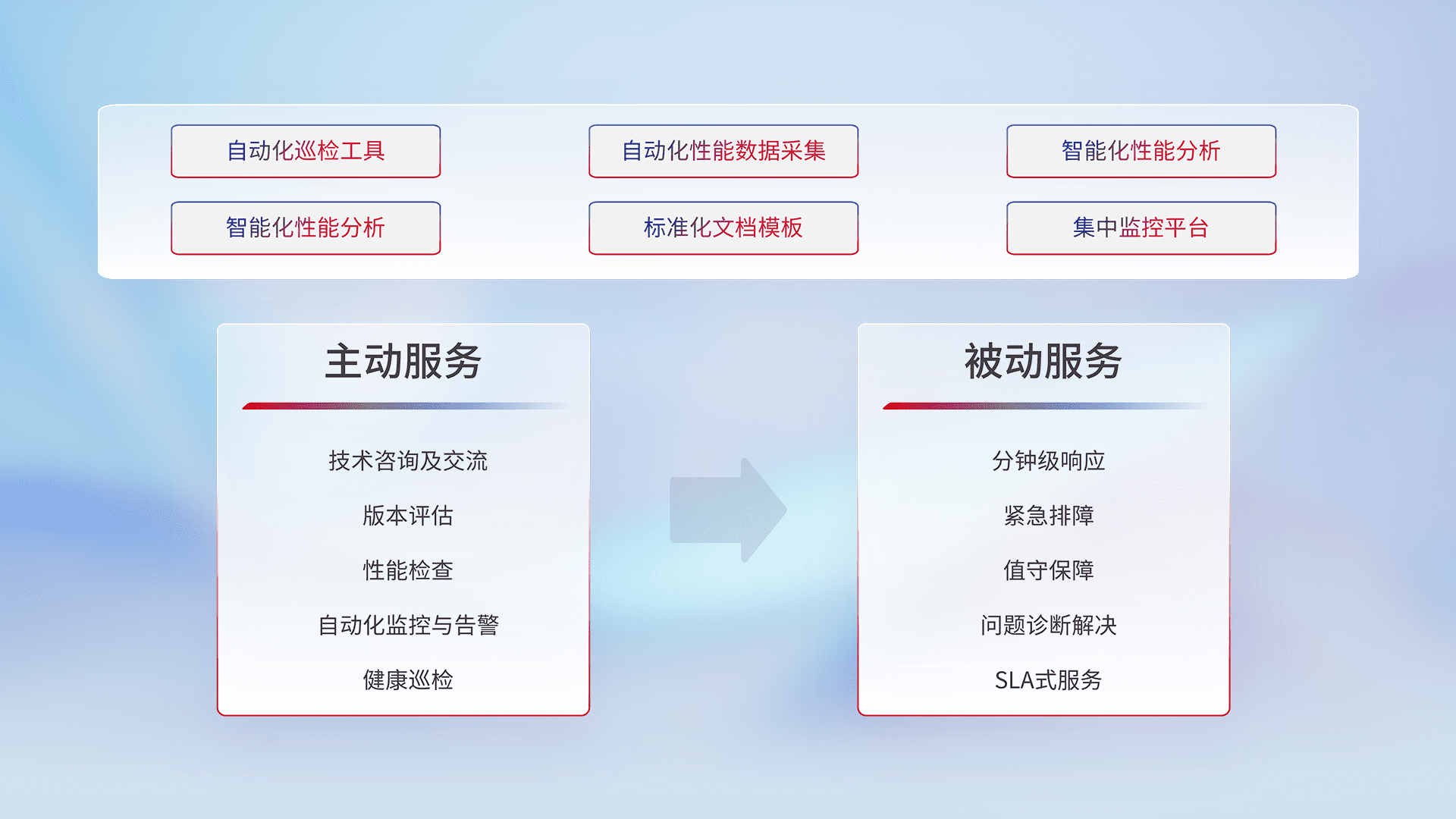 智能化工具和标准化文档,,,保障服务质量,,提供主动服务(包含技术咨询、、、、版本评估、、、、性能检查、、自动化监控与告警、、、、健康巡检)和被动服务包含(分钟级响应、、、紧急排障、、值守保障、、、、问题诊断解决、、SLA服务)。。